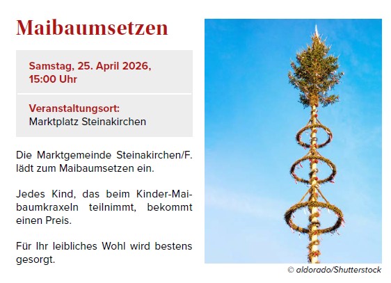 Maibaumsetzen am 25. April 2026 ab 15 Uhr am Marktplatz Steinakirchen am Forst